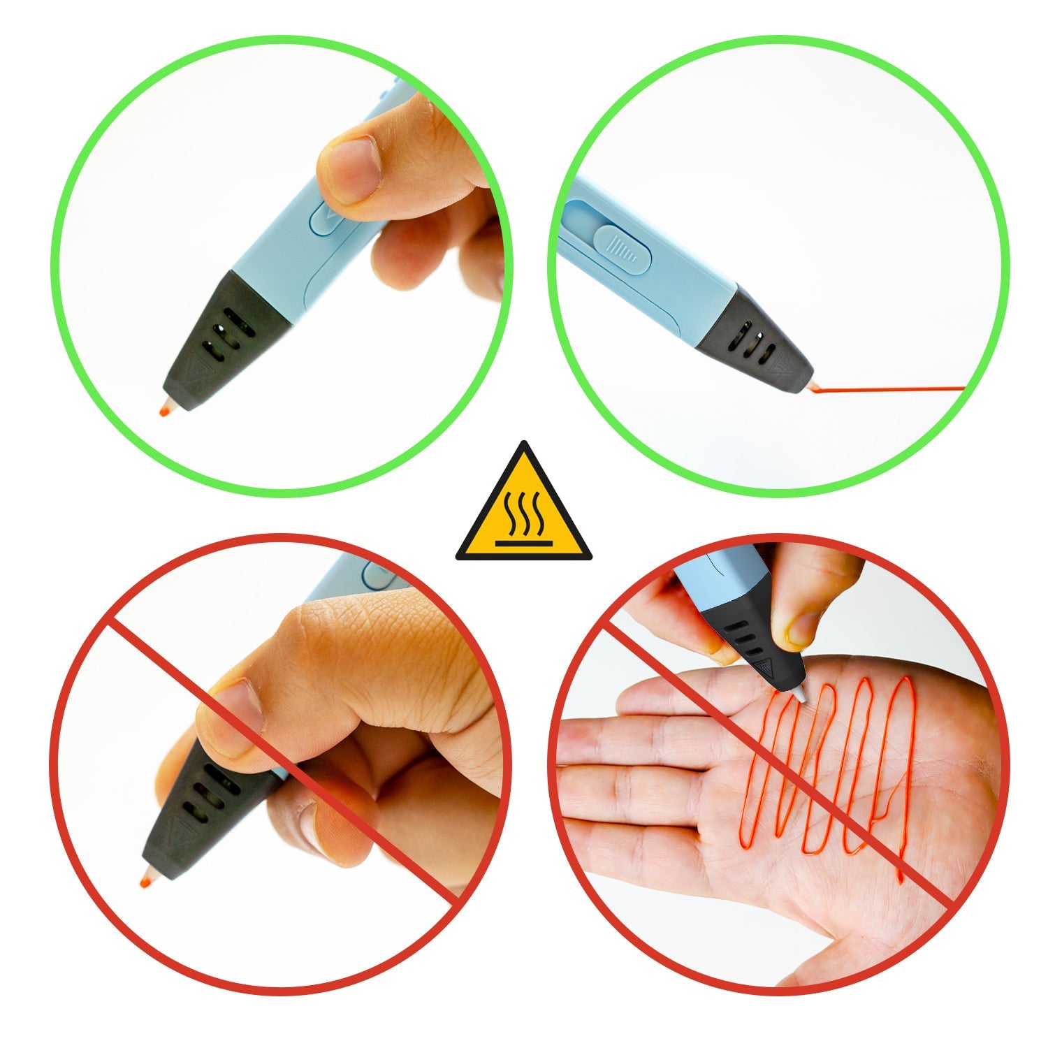 皮膚に描かないでください:使用中はペンの先端が高温になり、やけどの原因となることがあります。フィラメント自体は皮膚に触れても安全ですが、皮膚に直接描画することは避けてください。