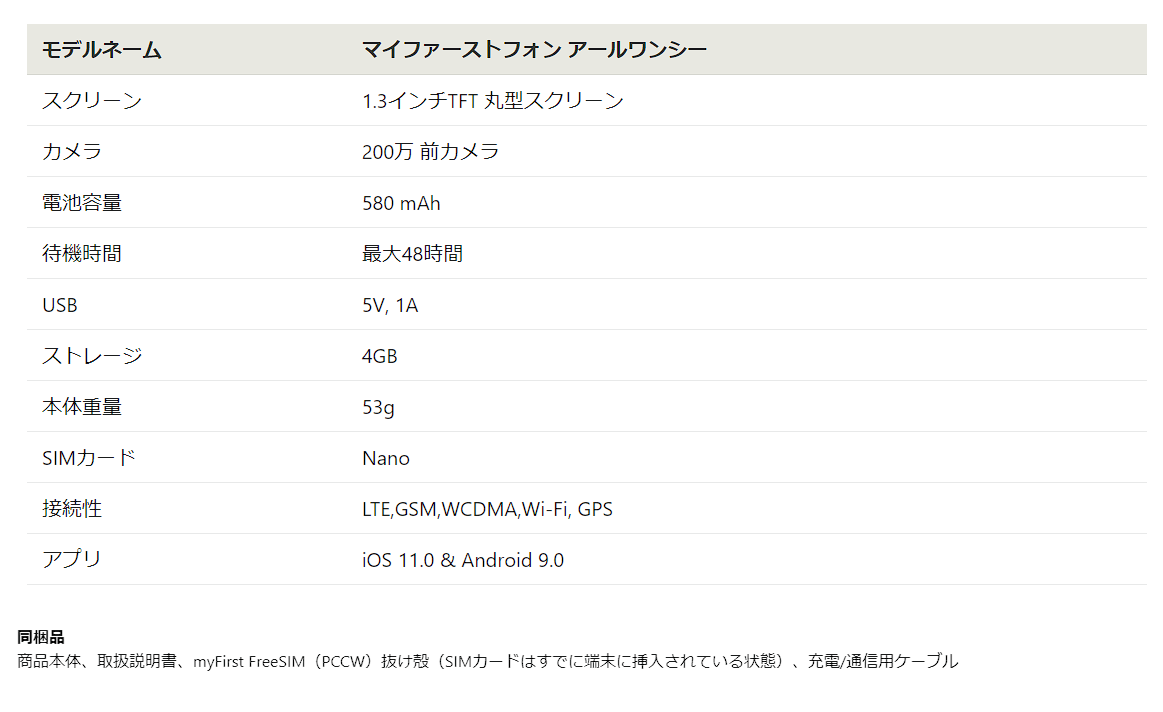 商品本体、取扱説明書、myFirst FreeSIM(PCCW)抜け殻(SIMカードはすでに端末に挿入されている状態)、充電/通信用ケーブル