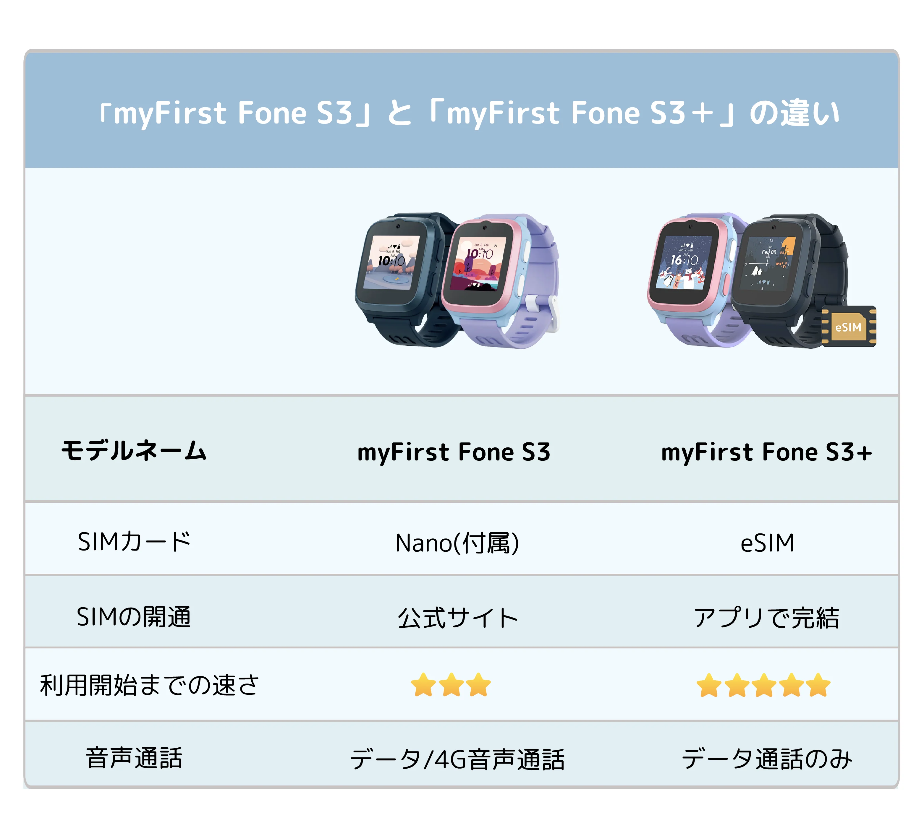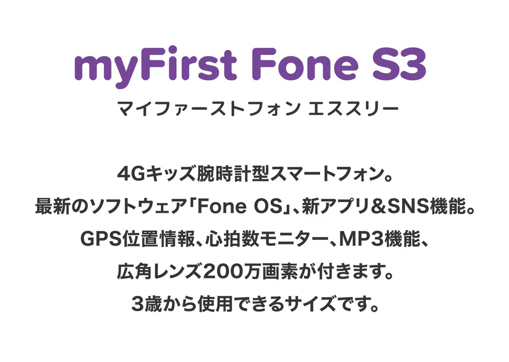 myFirst Fone S3は、子ども向けに設計されたスマートウォッチ型の見守り端末です。通話やGPSによる位置情報確認、心拍数モニター、エンタメ機能などを搭載し、親子のコミュニケーションと安心をサポートします。