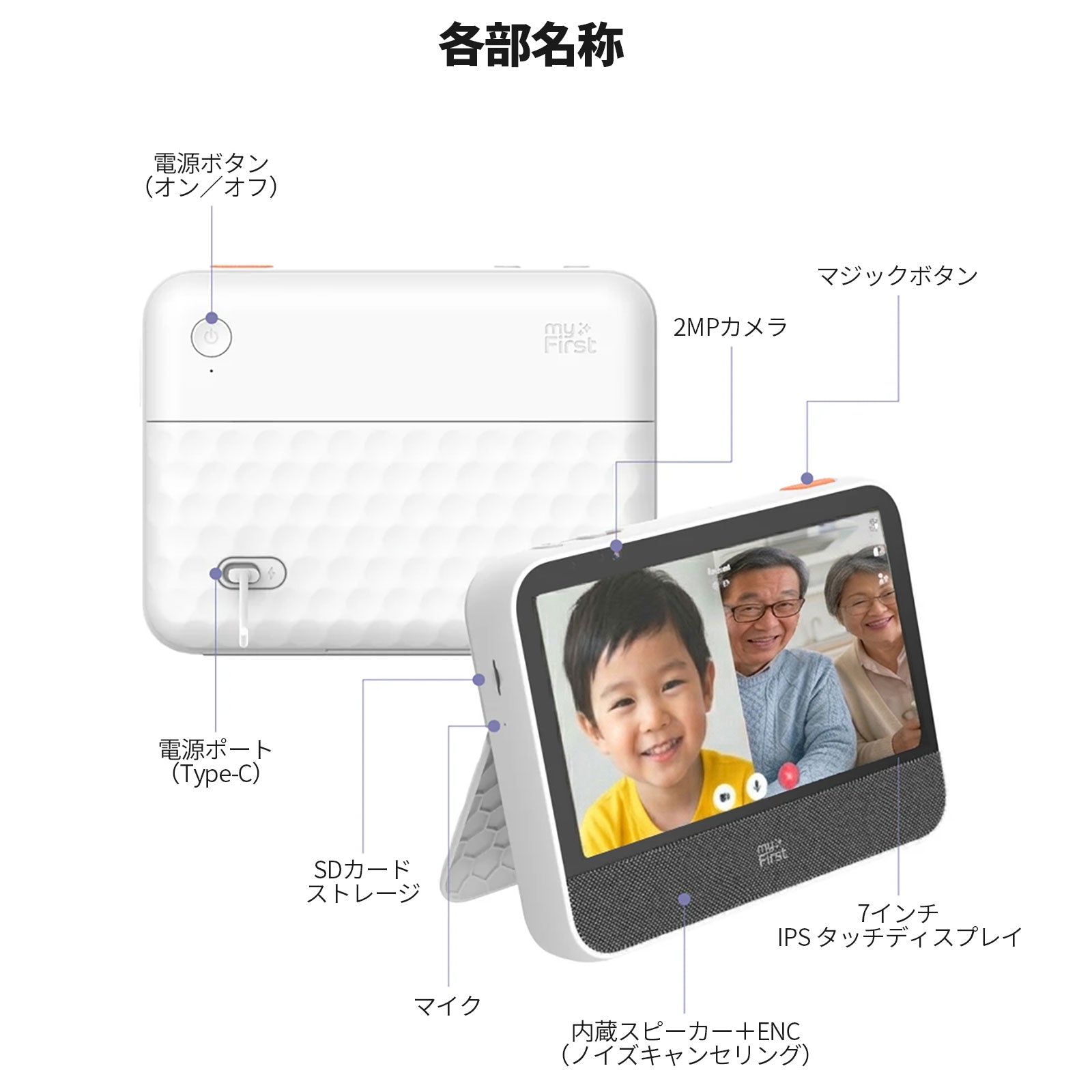 myFirst Circleアプリを使えば、ワンタップでかんたんにビデオ通話ができます。ノイズキャンセリング対応のデュアルマイクにより、周囲の雑音を抑え、家族との会話をはっきりクリアに届けます。